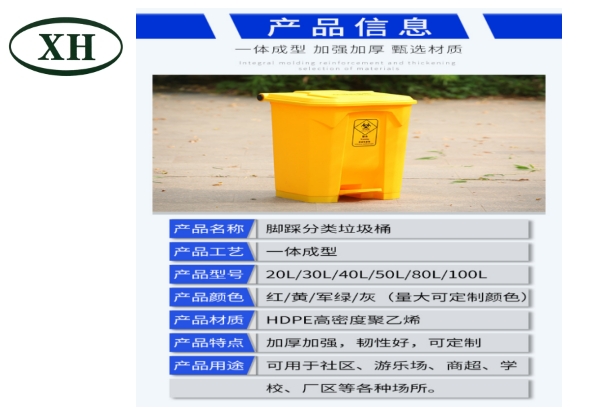 產品介紹腳踩垃圾桶介紹1、密度高的高壓聚乙烯或聚丙稀原材料注塑加工生產制造,使用壽命長。2、要采用全新升級原材料,合理避免弱酸性、···